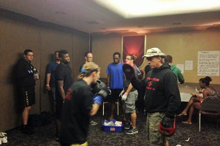 Ronni warming up as the other fighters look on before her march 21 fight at fishers ballroom in Bellville il. she won on a unanimous decision.